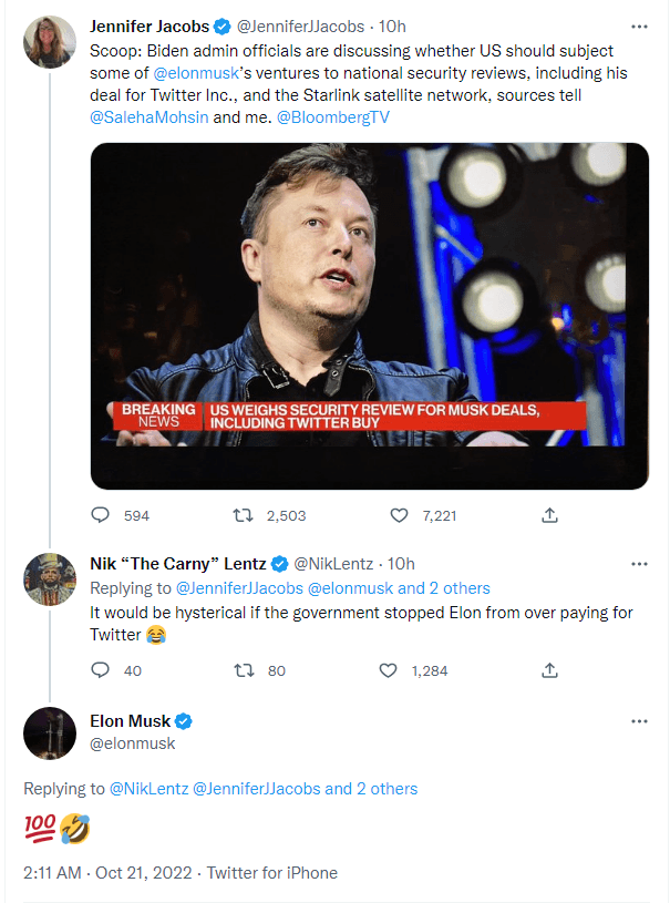 One must assume the reason for the sell-off is fear the deal once again gets delayed or falls through. A tweet from Jennifer Jacobs, a Bloomberg White House reporter, seems to be the cause for concern. We have to give kudos to the reply from Musk himself.
