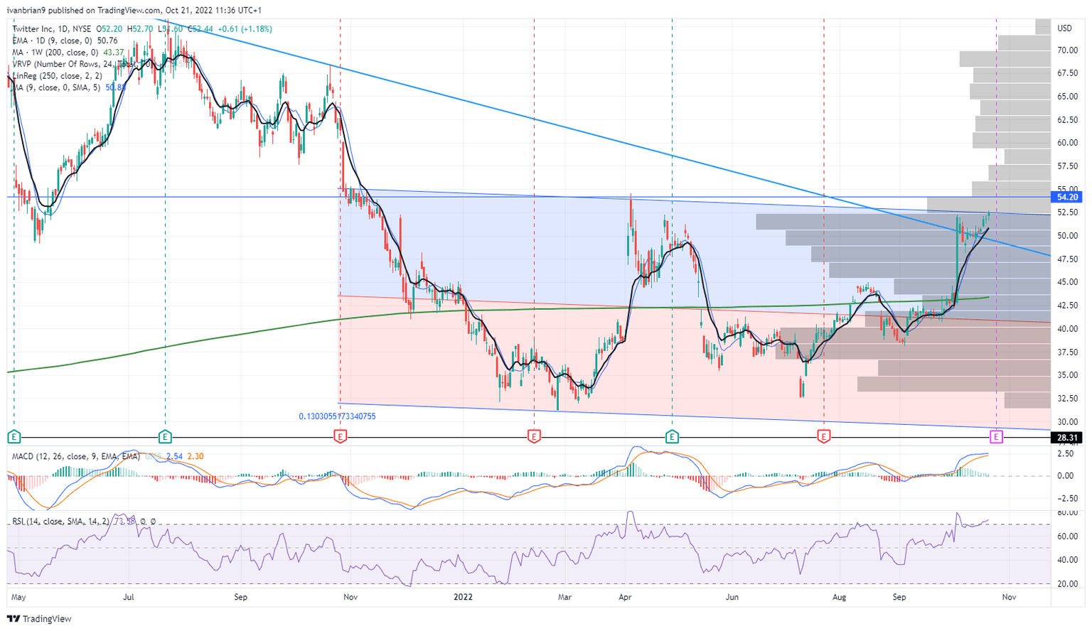 This is not a technical analysis play. It is a deal play. $54.20 is the deal price. Support is at $43 from the 200-week moving average. On the previous occasion when it looked like the deal was off, Twitter settled around $40. These levels can perhaps be looked at as support zones, but this is a deal play, plain and simple.