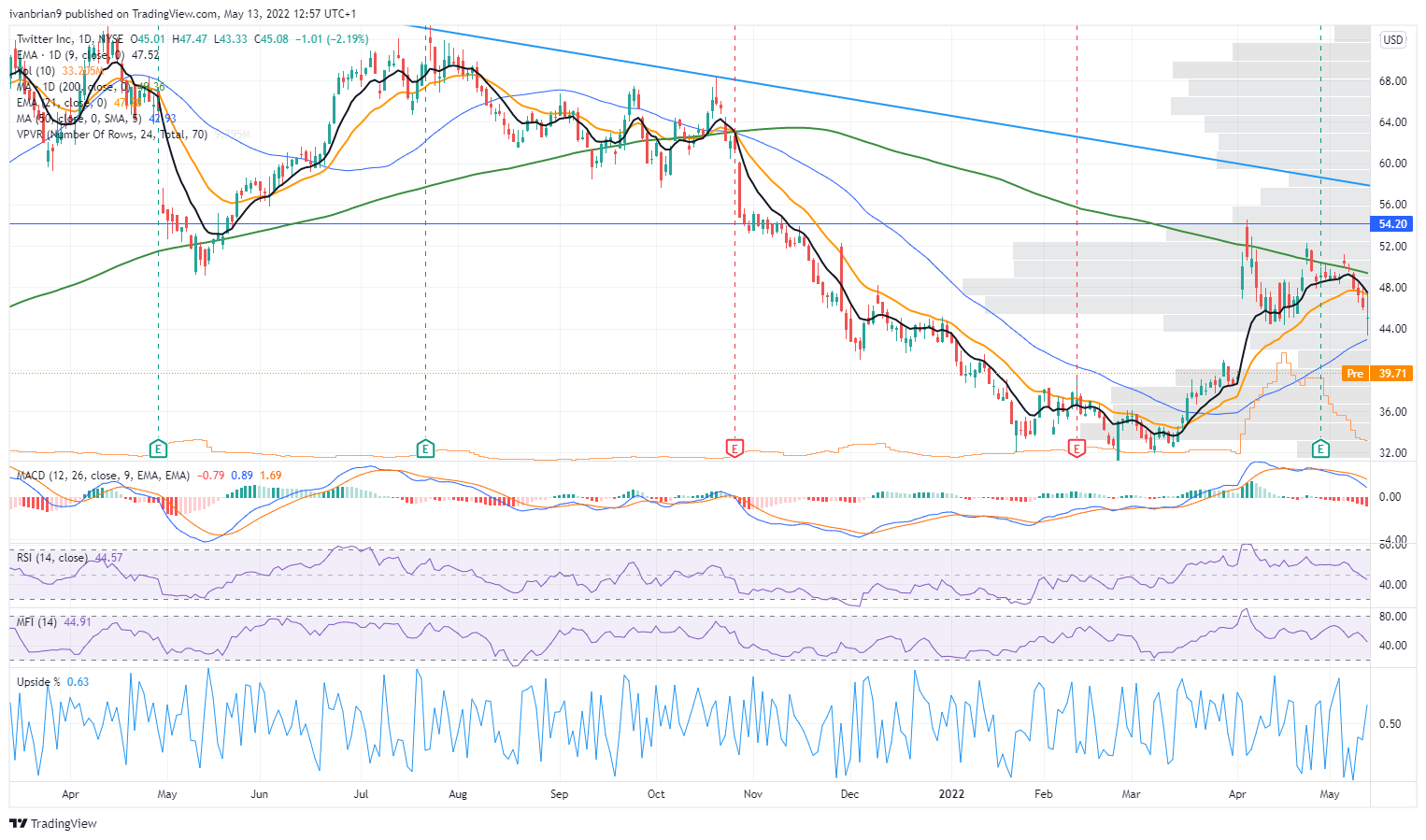 So where now? We always mentioned TWTR stock goes to $30 if the deal collapses. So far it has not collapsed but is merely on hold. Let's see how that works out then! Twitter was trading around $40 before the announcement of Elon Musk's initial stake. It spiked to $54.57 but only went to $48 after he made his offer to buy Twitter for $54.20. So let's go back in time. Twitter is trading at $40, next the Nasdaq collapses 17%, which brings Twitter down to $33. So we have a bit more room to run then, assuming the deal does not go through.