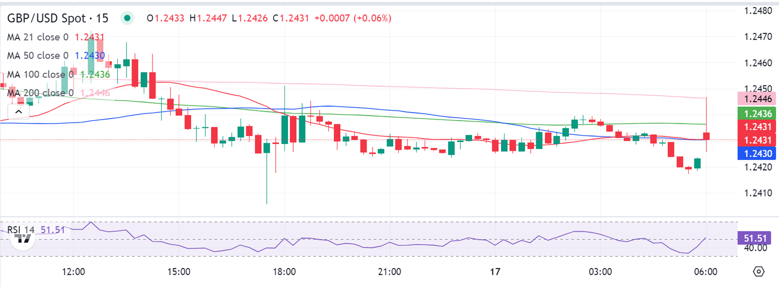 GBP/USD popped to test 1.2450 in an immediate reaction to UK CPI data, before quickly reversing to near 1.2440, where it now wavers. The pair is trading 0.12% higher on the day.