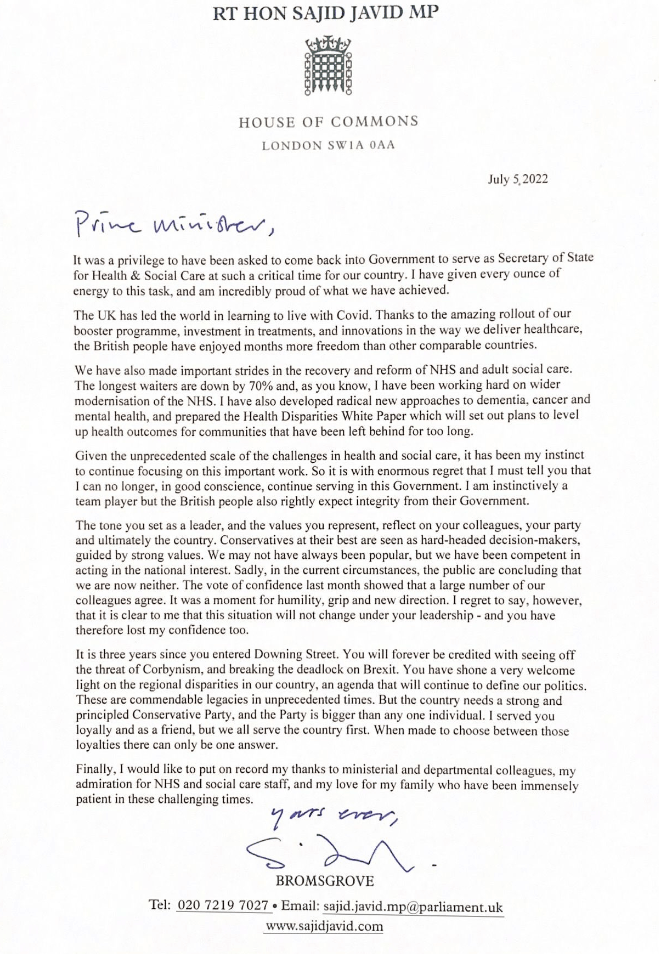 Firstly, British Health Secretary Sajid Javid resigned from Prime Minister Boris Johnson's government on Tuesday, he said in a statement.