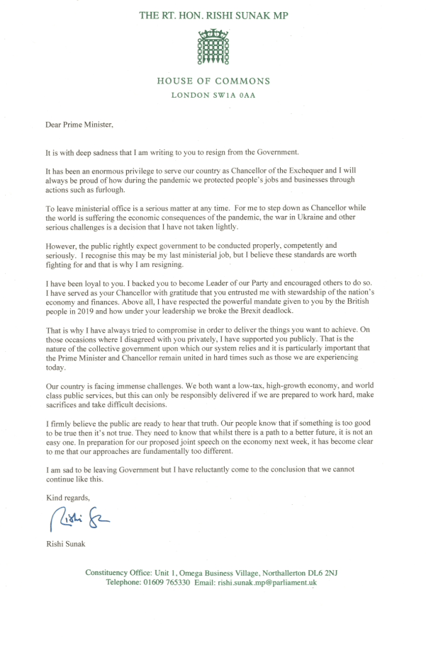 The public rightly expects the government to be conducted properly, competently and seriously. I recognise this may be my last ministerial job, but I believe these standards are worth fighting for and that is why I am resigning," Sunak wrote on Twitter.