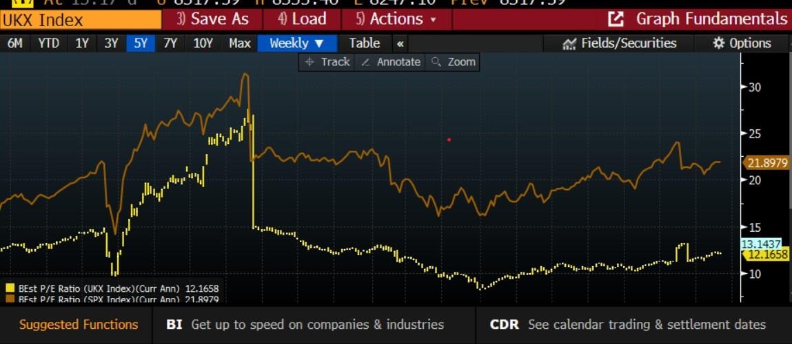 Chart 1: Valuation gap UK and US stocks (FTSE 100 and S&P 500, Best P/E ratios, 5-year chart)