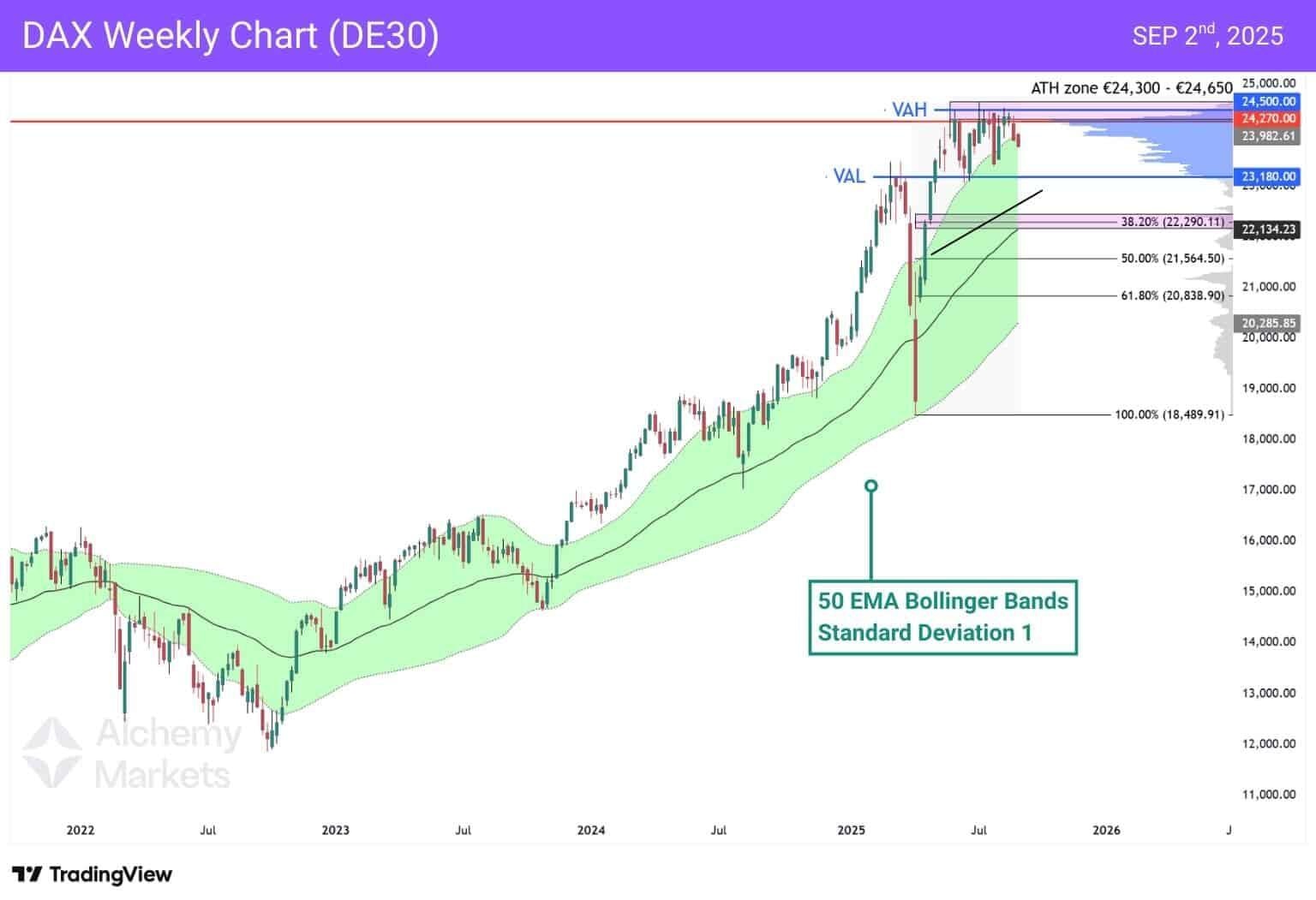 The DAX is still pinned under €24,500, with the POC since April lodged at the highs. That suggests distribution rather than clean accumulation, raising the risk of a long squeeze.