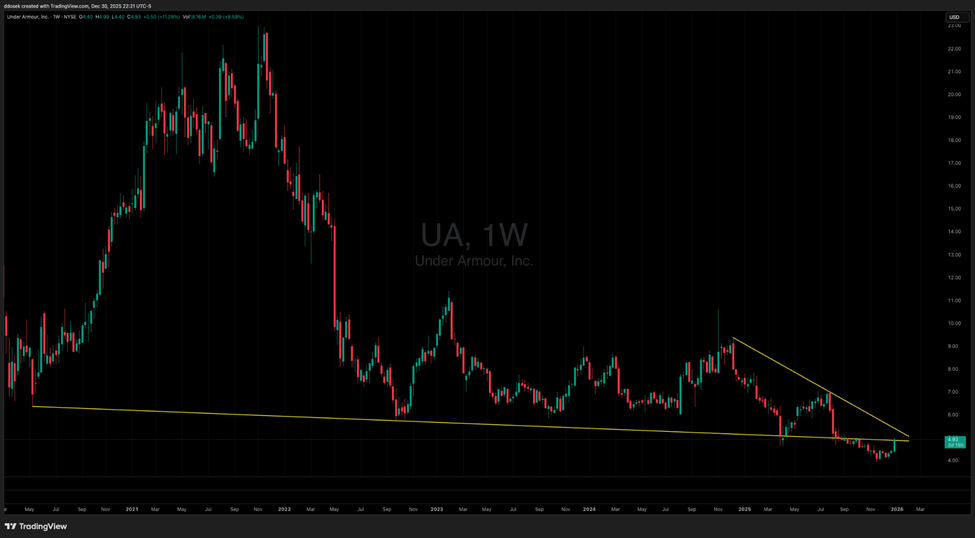 For this breakout to be truly "secured," we need to see follow-through. Resistance is sitting right overhead, first at $5.15 and then at $5.51. Adding to the challenge is a separate declining trendline from December 2024 that cuts right through those levels. To punch through that double-layer of resistance, UA will likely need the help of a short squeeze to create the kind of sustained buying pressure that turns a temporary pop into a real trend reversal.