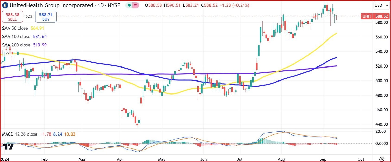 UnitedHealth Group (UNH) traded about 0.7% lower to $587 on Thursday, continuing on from Wednesday’s 1.6% decline. The leading US health insurer has been hurt by the week’s higher core inflation reading, as well as a perceived win by Vice President Kamala Harris in Tuesday’s presidential debate.