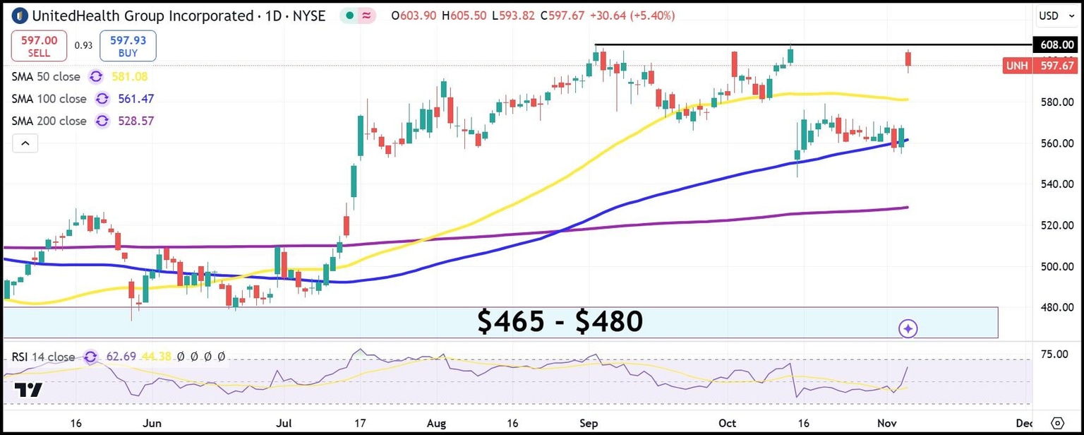 UnitedHealth stock is nearing resistance at $608. This level was difficult to maintain on September 4 and October 14. There have been other instances in the past two months where rallies dissipated once they rose above $600.