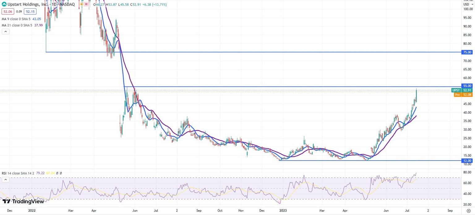 Upstart stock is now reaching the top end of a resistance level at $55. That resistance area ranges from about $52 and comes from a bullish reversal attempt in May and June of 2022. The stock has come a long way this year and is already up 310% year to date.