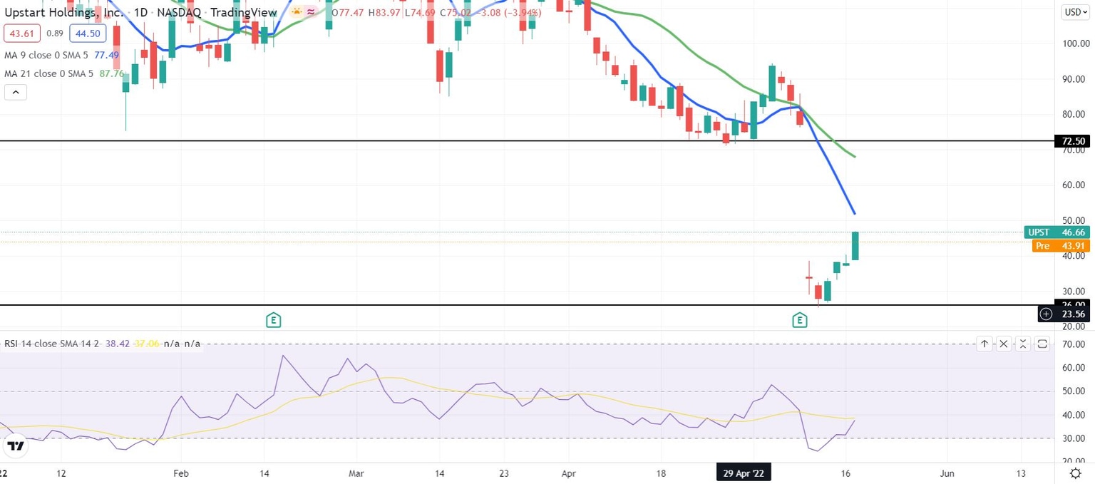 Update: The lending technology company Upstart Holdings (NASDAQ: UPST) bucked the broader market sell-off and gained 3.60% on Wednesday, settling at $48.34. The surge lifted the stock price to the highest levels in seven days, as buyers capitalized on the recovery rally from two-year lows of $25.43. Major Wall Street indices plunged on resurfacing global growth worries, in the face of surging inflation and central banks’ policy tightening. Although UPST showed solid resilience and stood out, as investors remained optimistic on the stock amid encouraging fundamental news. Upstart announced that Sharonview Federal Credit Union has become the latest financial institution to partner with Upstart on personal loans.