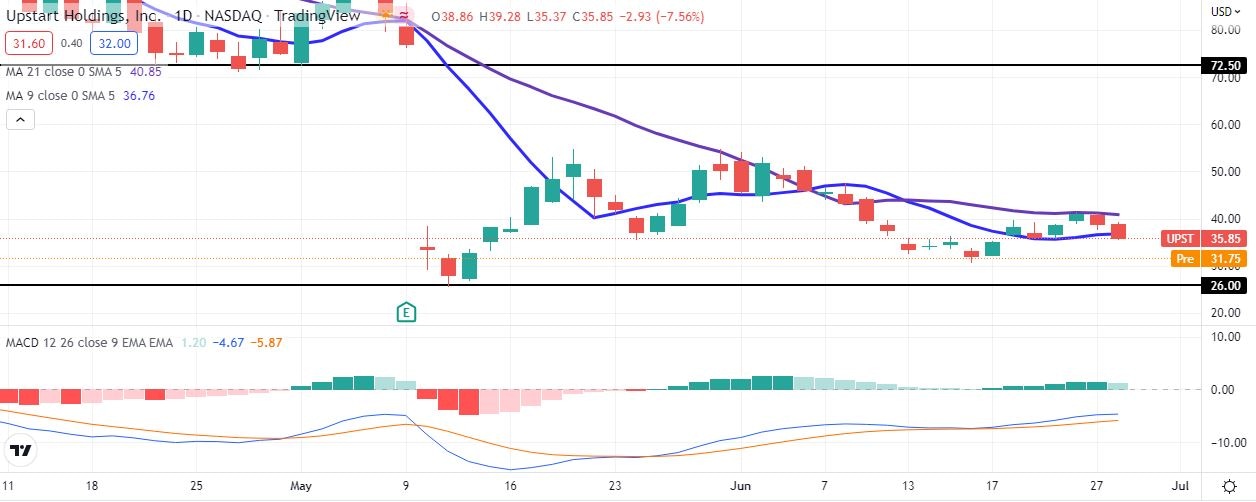 Upstart Holdings (UPST) stock has lost more than 10% in Wednesday's premarket after a downgrade by Morgan Stanley. The investment bank's analyst James Faucette says with interest rates expected to rise even more in the second half of the year, Upstart may receive less demand for its often high-priced loans. UPST shares traded down 10.7% to $32 in the premarket.