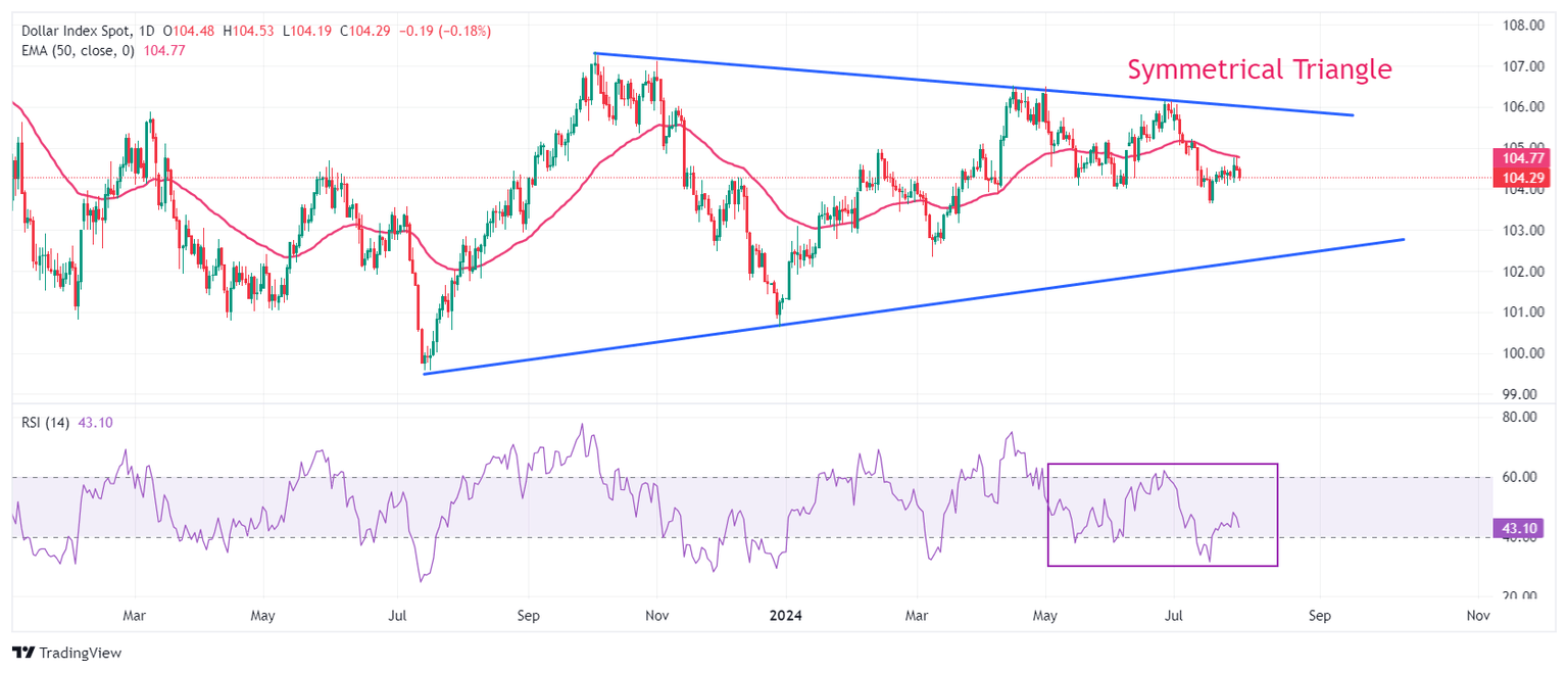 The USD Index trades in a Symmetrical Triangle formation, on a daily timeframe, which exhibits a sharp volatility contraction. The above-mentioned chart pattern results in a sideways trend with lower volume and smaller ticks. The near-term trend remains bearish as the 50-day Exponential Moving Average (EMA) around 104.77 is acting as major barricade for the US Dollar bulls.