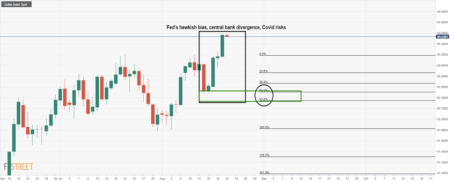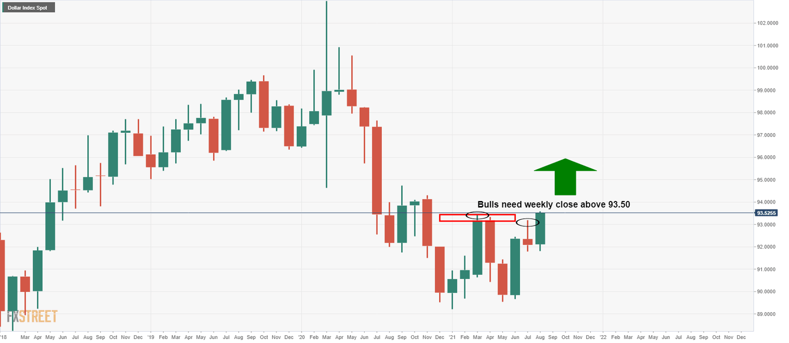 Bulls will want to see the price hold above here for a weekly close in the 93.50s. In doing so, it will embolden dollar bulls for the foreseeable future in the countdown to the Fed's tapering.