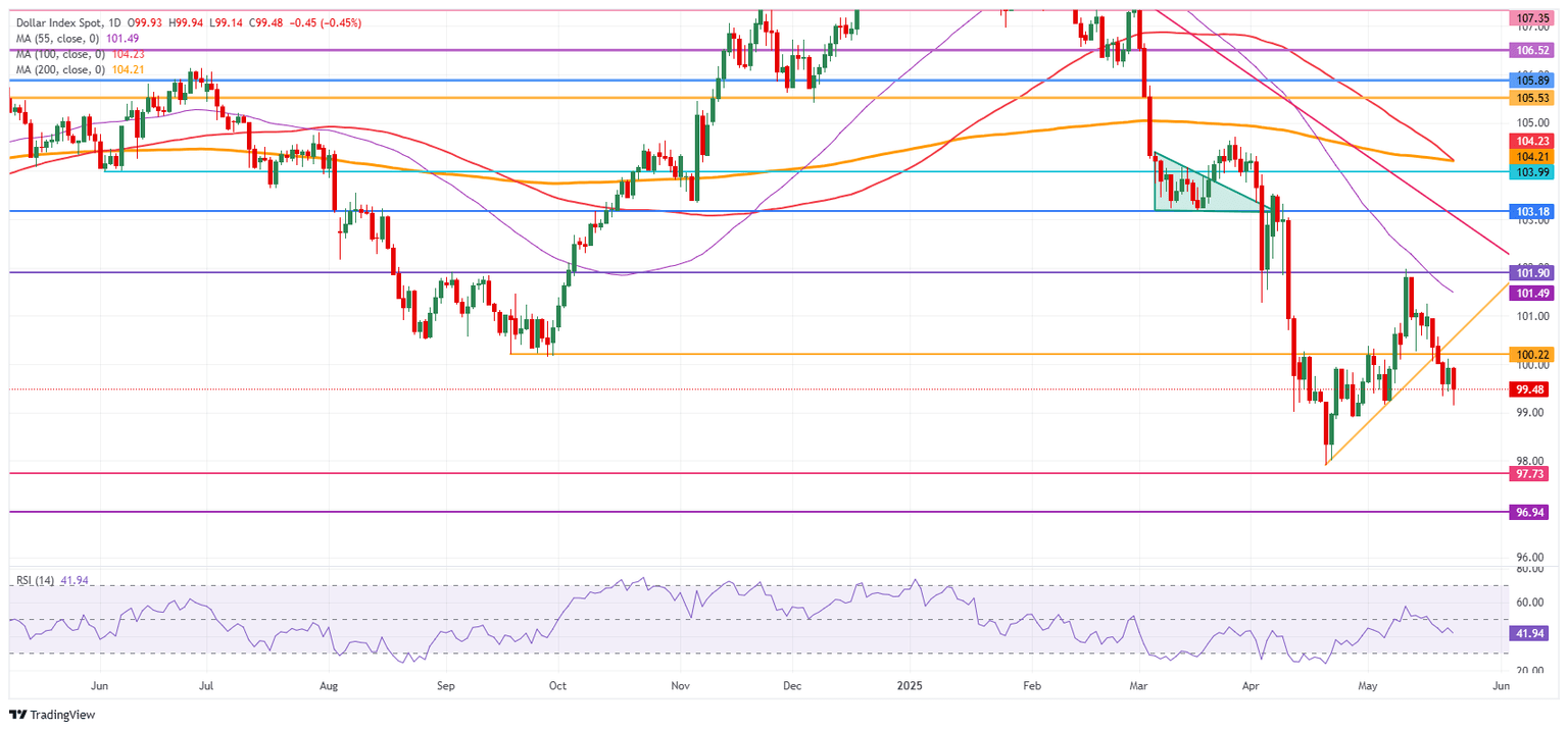 The US Dollar Index (DXY), which tracks the performance of the US Dollar (USD) against six major currencies, dips further on Friday and erases the previous day’s recovery, trading near 99.20 at the time of writing. The fresh leg lower comes after the House of Representatives passed United States (US) President Donald Trump’s spending bill, now on its way to the Senate. The nonpartisan Congressional Budget Office revealed that this "big, beautiful bill" comes with a hefty price tag: $3.8 trillion in additional debt to the federal government's $36.2 trillion over the next decade, according to Reuters.