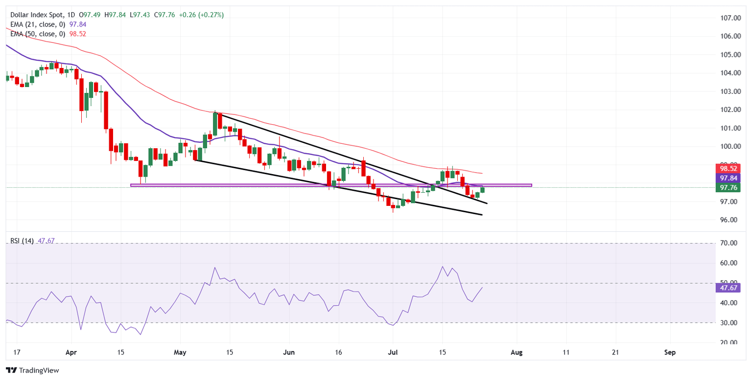 The US Dollar Index (DXY), which measures the Greenback against a basket of six major currencies, is edging modestly higher during Friday’s American trading hours, recovering from a two-week low touched earlier in the week. At the time of writing, the index is hovering around 97.77. However, the DXY is on track to snap a two-week winning streak, struggling to gain traction above the 98.00 barrier. Still, caution prevails ahead of the August 1 tariff deadline and next week’s Federal Reserve (Fed) monetary policy decision, keeping traders on edge and limiting aggressive moves in the US Dollar.