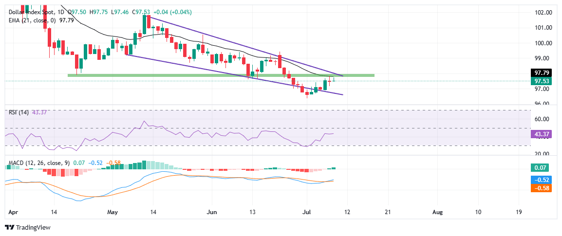 Momentum indicators are gradually turning supportive. The Relative Strength Index (RSI) is trending higher, currently at 44.88, although it remains below the neutral 50 mark. Meanwhile, the Moving Average Convergence Divergence (MACD) has flipped into positive territory with a fresh bullish crossover, suggesting renewed bullish momentum. A daily close above 97.80 would confirm a breakout from near-term resistance and could pave the way for a move toward the next target at 98.40, the high of June 24. On the flip side, rejection here would keep the broader downtrend intact and shift focus back to the 97.00–96.80 support zone.