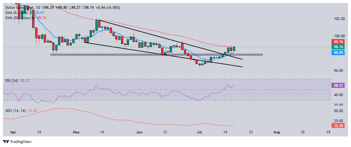 The US Dollar Index (DXY) is showing early signs of a bullish reversal after breaking out of a falling wedge pattern that had capped price action for over two months. This breakout suggests that bearish momentum is weakening, and buyers are gradually regaining control. The index is now testing a key resistance zone around 98.70-98.80, which aligns with the 50-day Exponential Moving Average (EMA). A clear break and daily close above this zone could confirm bullish momentum and pave the way toward the 99.50 region, near the June 23 swing high, and possibly extend toward the psychological 100.00 level.