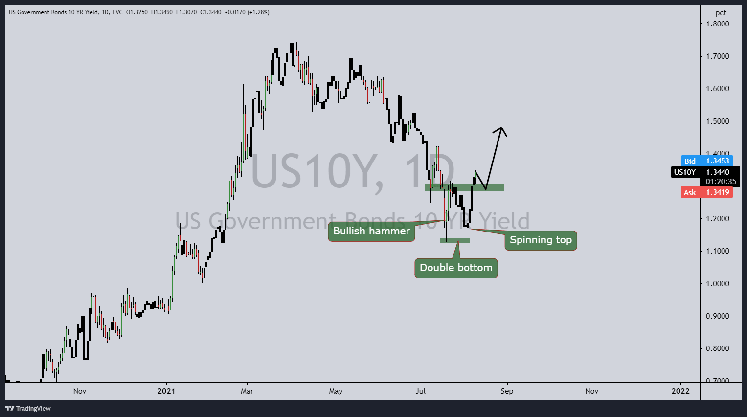 The 10-year yield rallied to a fresh recovery high on Tuesday of 1.3490%, up from 1.1270%, weekly lows posted on 4 Aug.