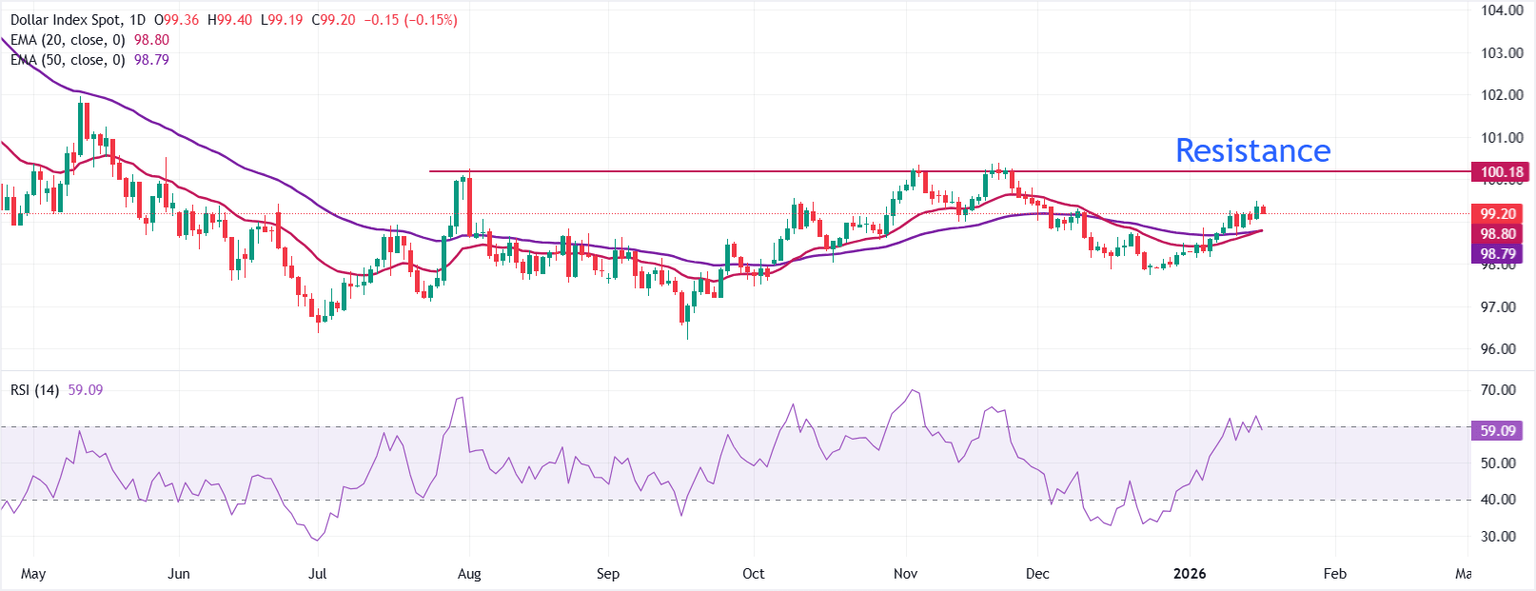 In the daily chart, the Dollar Index Spot trades at 99.20. Price holds above the rising 20-Exponential Moving Average (EMA) at 98.80 and the 50-EMA at 98.79, with these averages acting as immediate supports. The 20-EMA rises marginally above the 50-EMA, reinforcing a positive near-term bias.