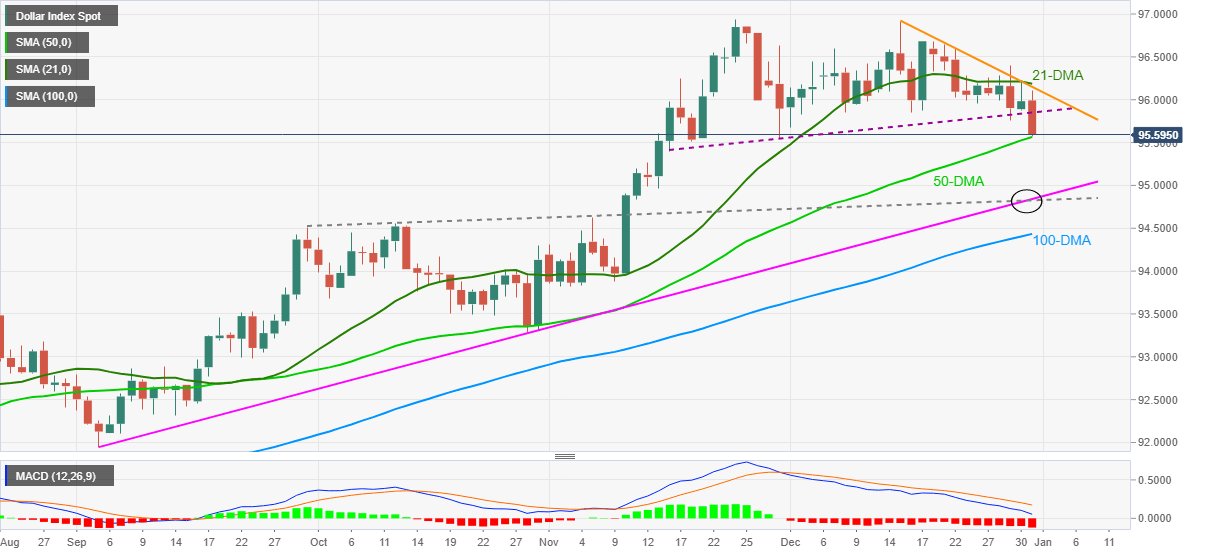 In doing so, the greenback gauge keeps Friday’s downside break of the previously important support line from November 16, now resistance around 95.85.