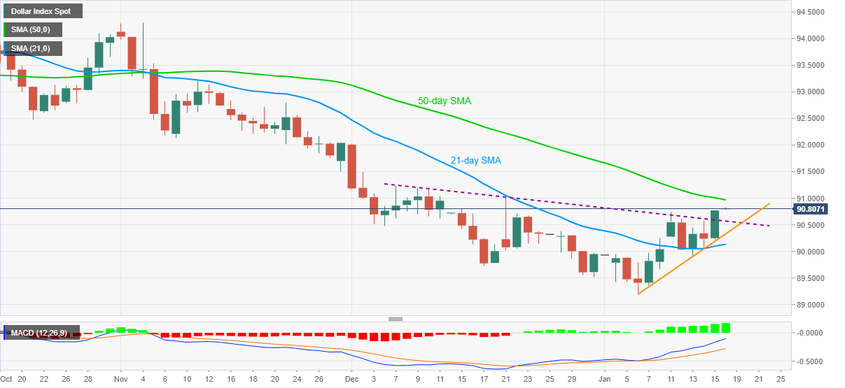 US dollar index (DXY) stays positive around 90.81 during Monday’s Asian session. In doing so, the greenback gauge extends the upside break of a descending trend line from December 07 towards a fresh high since December 21.