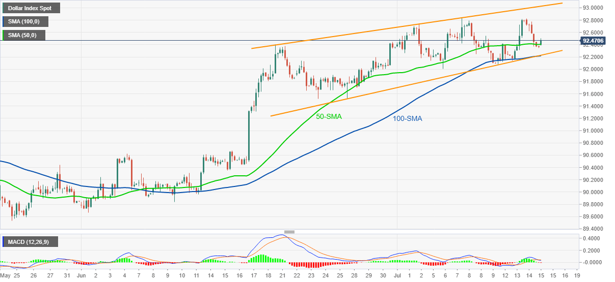 Alternatively, a downside break of 50-SMA, around 92.40, will be challenged by the 92.20 crucial support level, a convergence of 100-SMA and the stated wedge’s lower line.