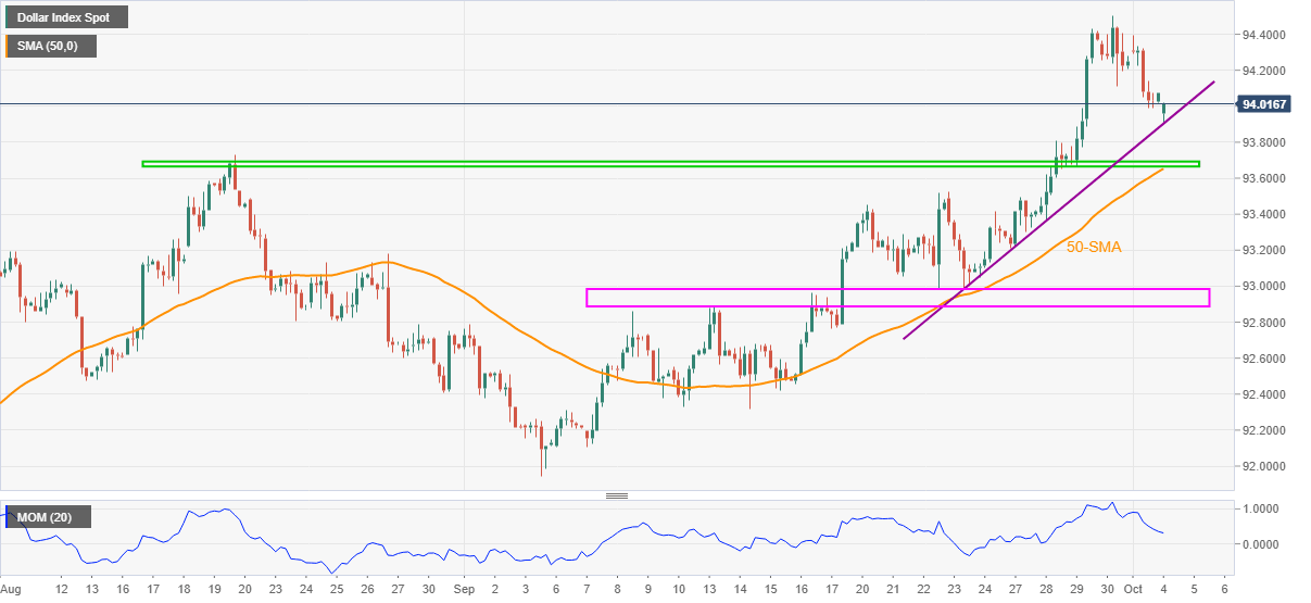 US Dollar Index (DXY) takes the bids to refresh intraday high to 94.01 during early Monday. In doing so, the greenback gauge bounces off a short-term support line to consolidate the latest pullback from the yearly top.