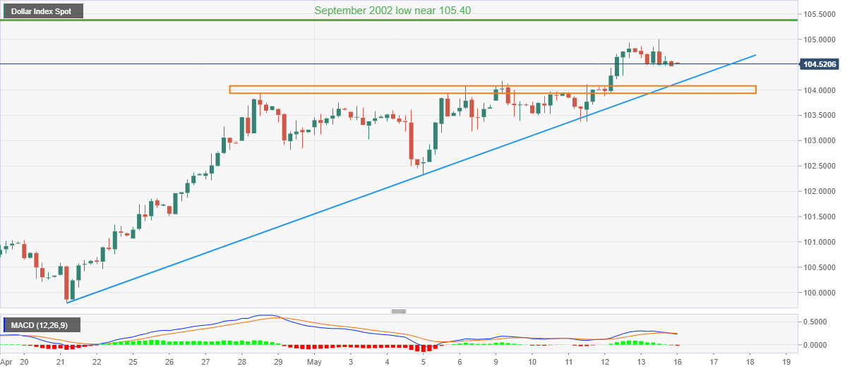 In doing so, the greenback gauge justifies recently downbeat MACD signals to approach a three-week-old rising trend line support, near 104.10 by the press time.
