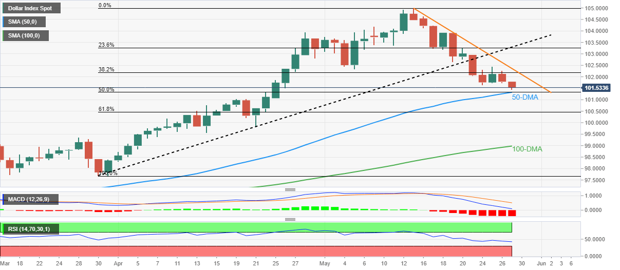 However, a convergence of the 50-DMA and 50% Fibonacci retracement of late March to early May upside, around 101.30, appears a tough nut to crack for the bears.