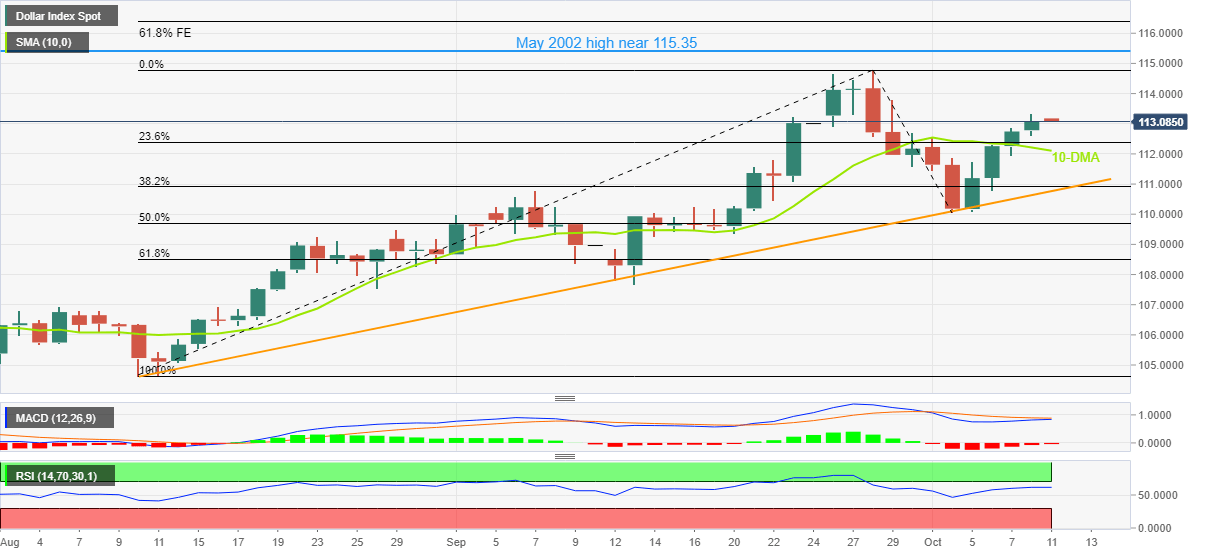 US Dollar Index (DXY) buyers take a breather around 113.00, extending a pullback from a one-week high during early Tuesday’s sluggish Asian session. Even so, the sustained trading beyond the short-term moving average and the price-positive signals from the oscillators keep the buyers hopeful.