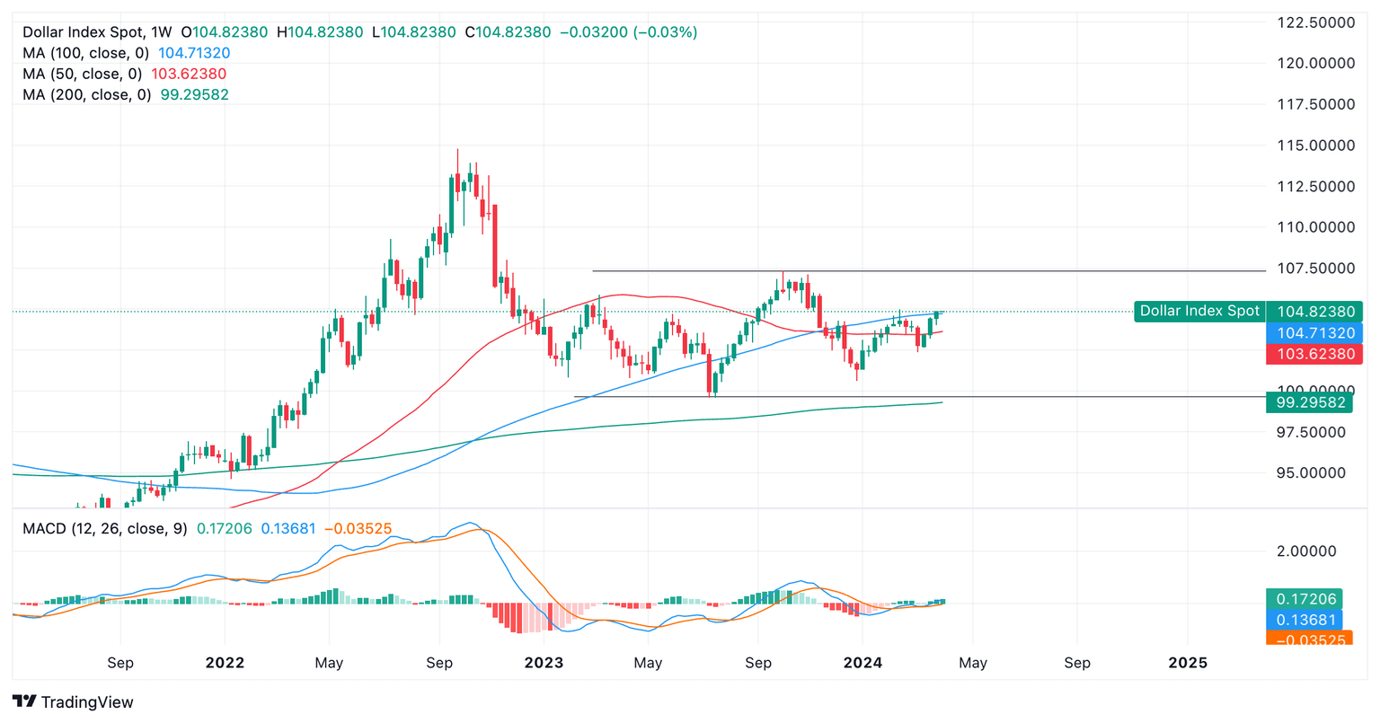 Since the index found a floor in 2023 it has been oscillating between the aforementioned lows and a top at roughly 107.00.