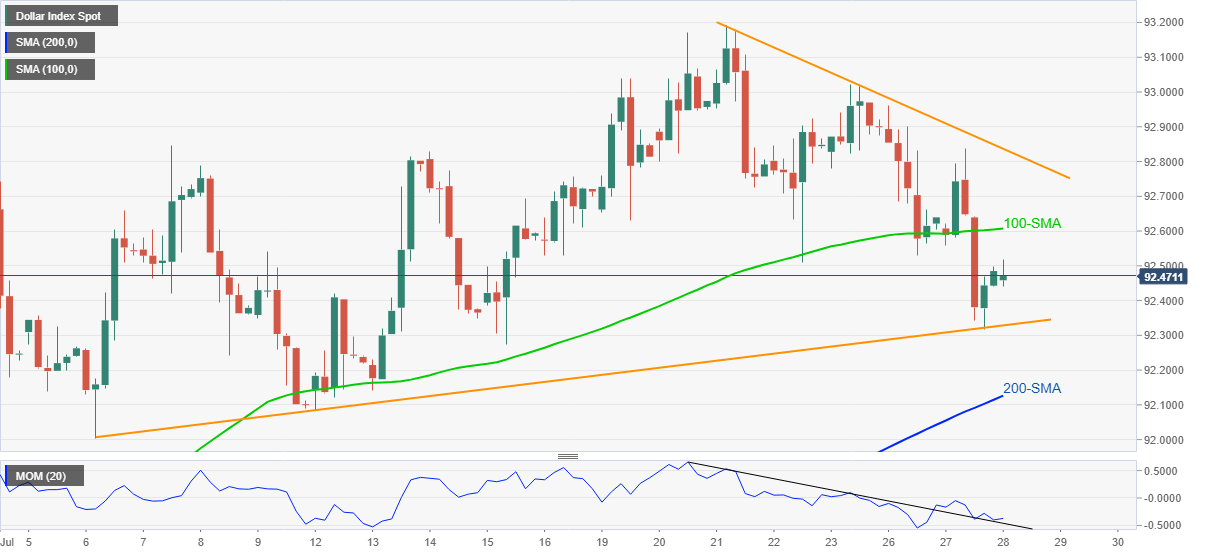 US Dollar Index (DXY) consolidates the weekly losses, flirts with an intraday top around 92.50, amid early Wednesday. In doing so, the greenback gauge justifies the market’s cautious mood ahead of the US Federal Open Market Committee (FOMC) verdict while keeping the bounce off a short-term support line.