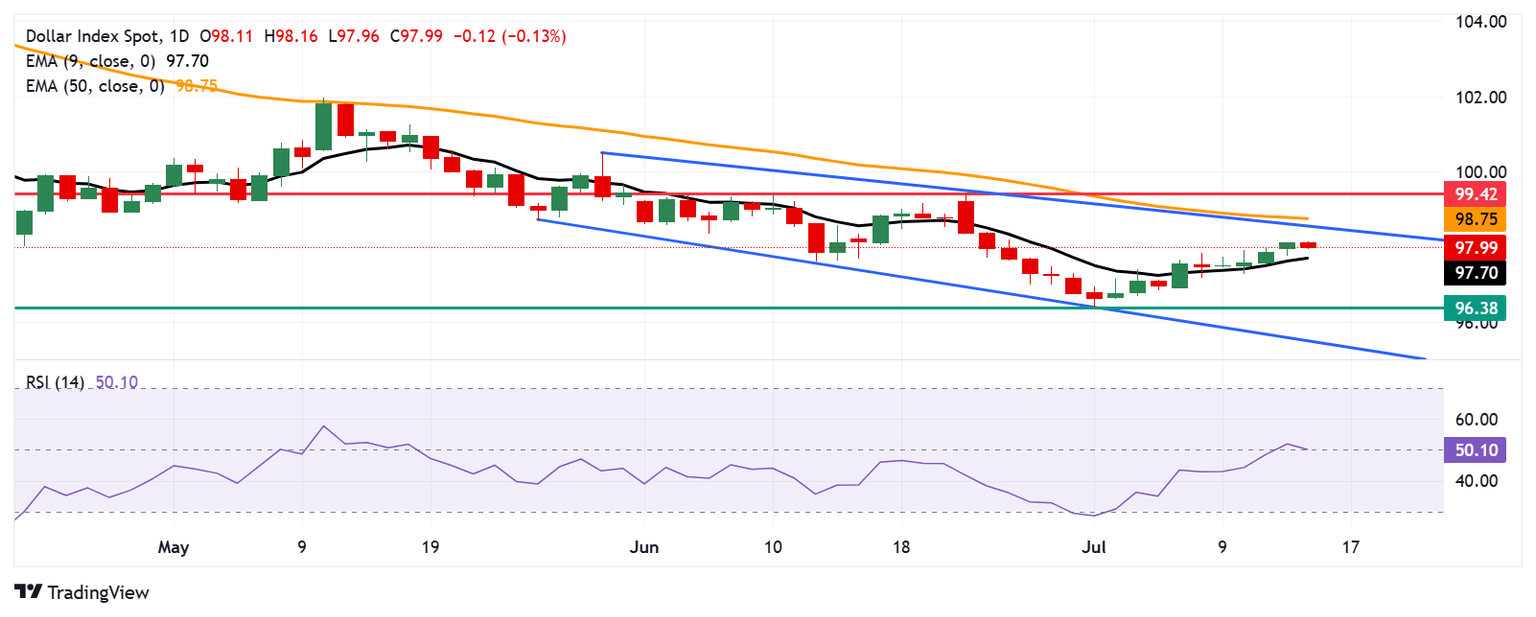 The US Dollar Index may test the primary barrier at the descending channel’s upper boundary around $98.60, followed by the 50-day EMA at $98.75. A break above this crucial resistance zone could strengthen the medium-term price momentum and support the DXY to approach the two-month high at $99.42, which was reached on June 23.