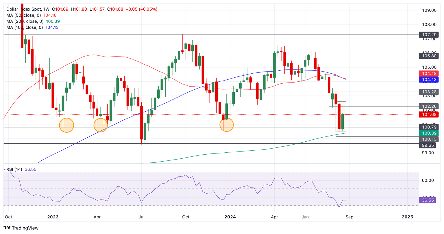 DXY has formed an unconfirmed bullish Piercing Line Japanese candlestick pattern (shaded rectangle) on the weekly chart at a historic support level in the 100s. This level has been tested multiple times in the past (orange bubbles).
