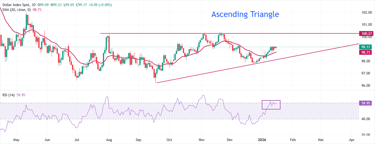 The US Dollar Index Spot trades slightly higher to near 99.16 at the time of writing. Price holds above the 20-day Exponential Moving Average (EMA) at 98.73, and the EMA has begun to slope higher, supporting a short-term bullish tone.