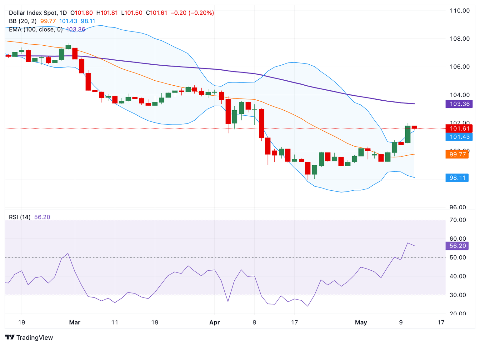 The US Dollar Index (DXY), an index of the value of the US Dollar (USD) measured against a basket of six world currencies, retreats from its highest level since April 10 to 101.60 during the early European trading hours on Tuesday. Nonetheless, optimism over a tariff deal between the United States (US) and China eases some fears of a trade war between the world's two largest economies, which supports the USD.