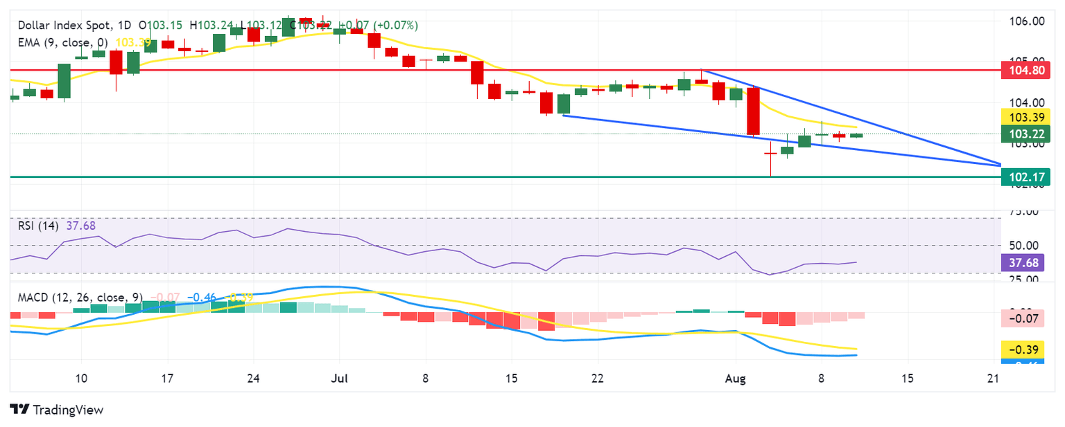 For resistance, the DXY may face an immediate barrier around the nine-day Exponential Moving Average (EMA) at 103.39 level, followed by the upper boundary of the descending wedge around 103.60 level. A breakout above this level could propel the index to retest a six-week high at 104.80, marked on July 30.