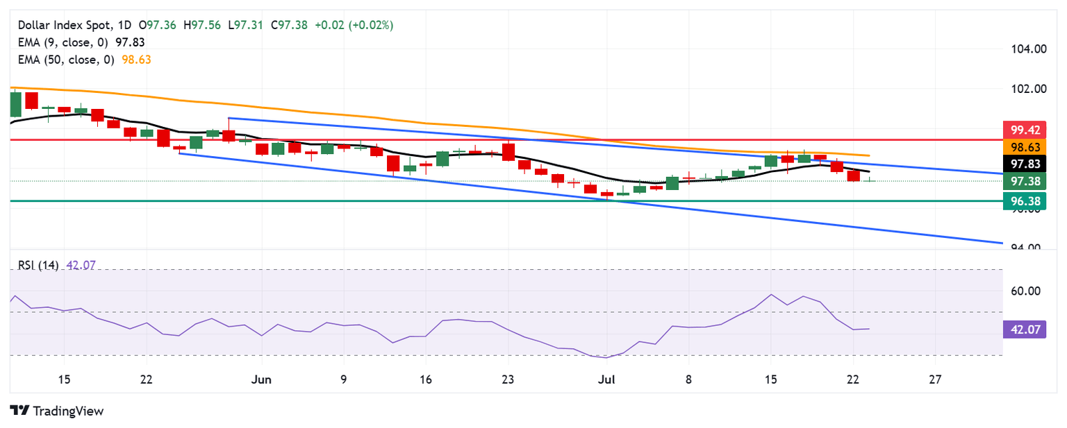 The US Dollar Index may test the primary barrier at nine-day EMA of 97.83, followed by the descending channel’s upper boundary around $98.30. A successful break above this crucial resistance zone would improve the short-term price momentum and support the DXY to test the 50-day EMA at 98.63. Further advances would strengthen the medium-term price momentum and prompt the dollar index to target the two-month high at $99.42, which was reached on June 23.