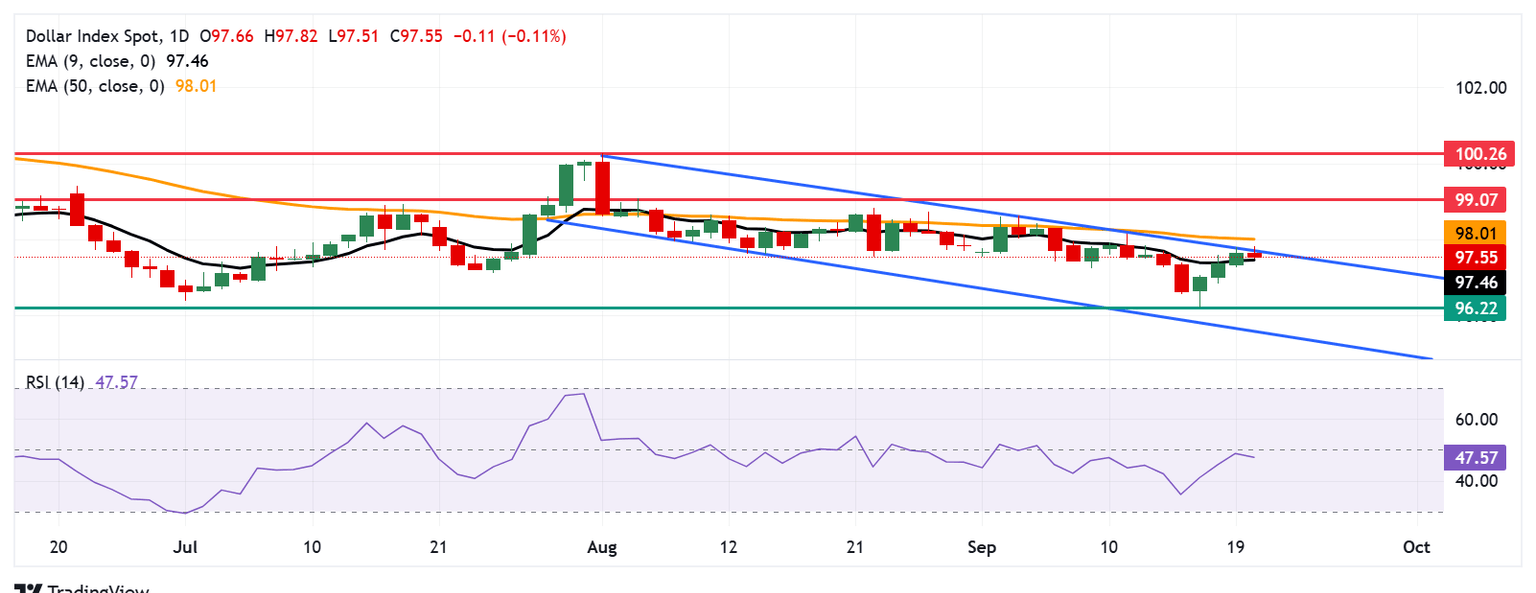 On the downside, the US Dollar Index is finding the immediate support at the nine-day EMA of 97.46. A break below this level would weaken the short-term price momentum and put downward pressure on the DXY to navigate the region around the 96.22, the lowest since February 2022, reached on September 17. Further declines would prompt the dollar index to test the lower boundary of the descending channel around 95.60.