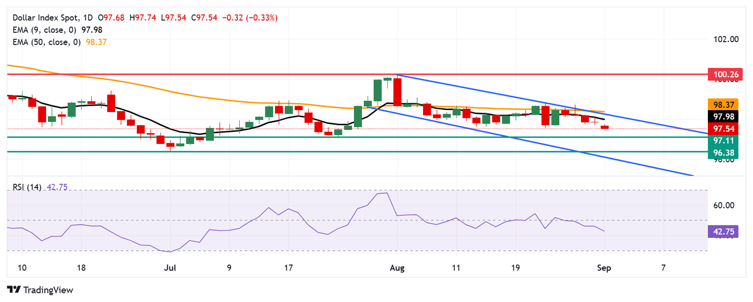 The primary barrier lies at the nine-day EMA of 97.98, aligned with the psychological level of 98.00. A break above this crucial resistance zone would improve the short-term price momentum and support the US Dollar Index to test the upper boundary of the descending channel around 98.30, followed by the 50-day EMA at 98.37. Further advances would improve the medium-term price momentum and lead the DXY to explore the region around the four-month high at 100.26, which was recorded on August 1.