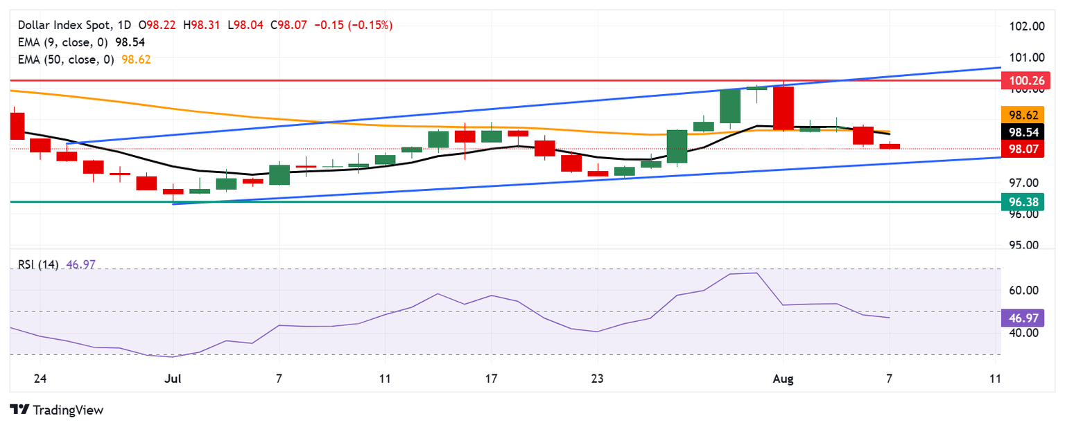 On the upside, the US Dollar Index may target the initial barrier at the 50-day EMA of 98.54, aligned with the 50-day EMA at 98.62. A successful breach above this level would strengthen the short- and medium-term price momentum and support the DXY to approach the three-month high at 100.26, which was recorded on August 1, followed by the upper boundary of the ascending channel around 100.40.