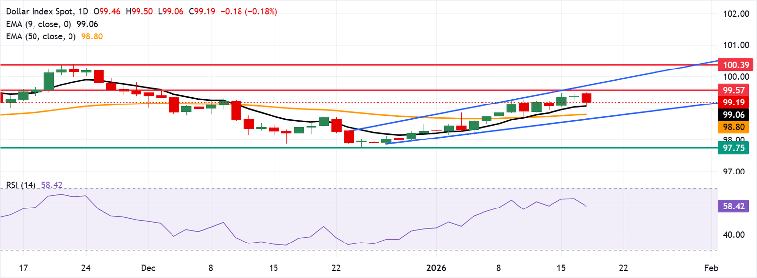 The US Dollar Index (DXY), which measures the value of the US Dollar (USD) against six major currencies, is losing ground after two days of gains and trading around 99.20 during the European hours on Monday. The technical analysis of the daily chart shows that the dollar index moves upward within the ascending channel pattern, suggesting a persistent bullish bias.