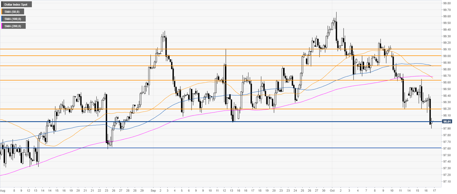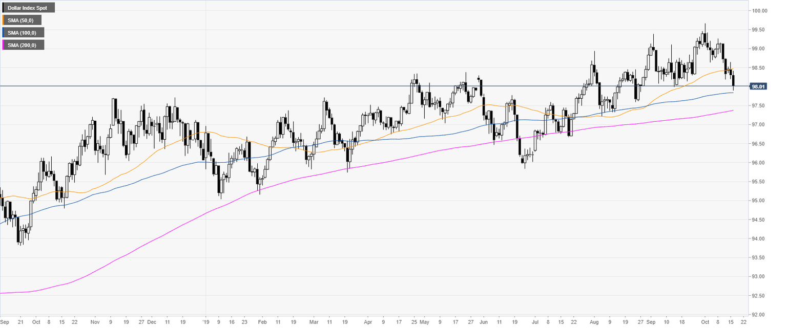 The US Dollar Index (DXY) is trading in a bull trend above the 100 and 200-day simple moving averages (DSMAs). This Wednesday the Greenback declined to the 98.00 handle, trading just above the 100 SMA. On the macroeconomic front, the Retail Sales Control Group in the United States disappointed coming out at 0% vs 0.3% in September, exacerbating the already negative sentiment on the US Dollar.