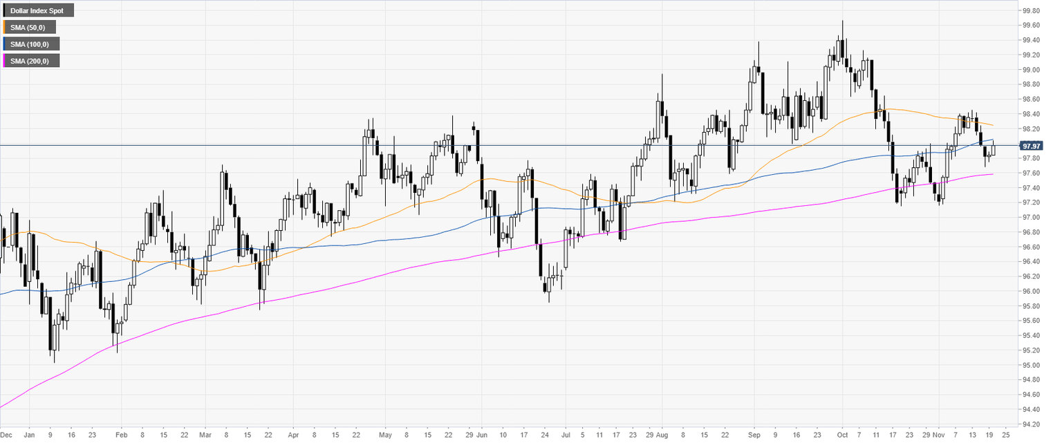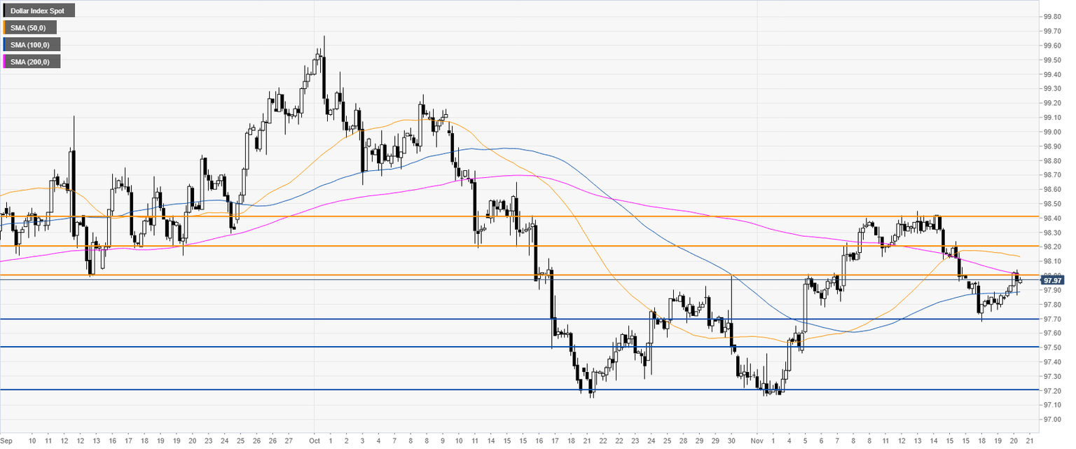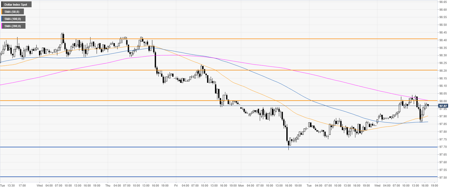 - DXY has been challenging the 98.00 handle ahead of the FOMC minutes.