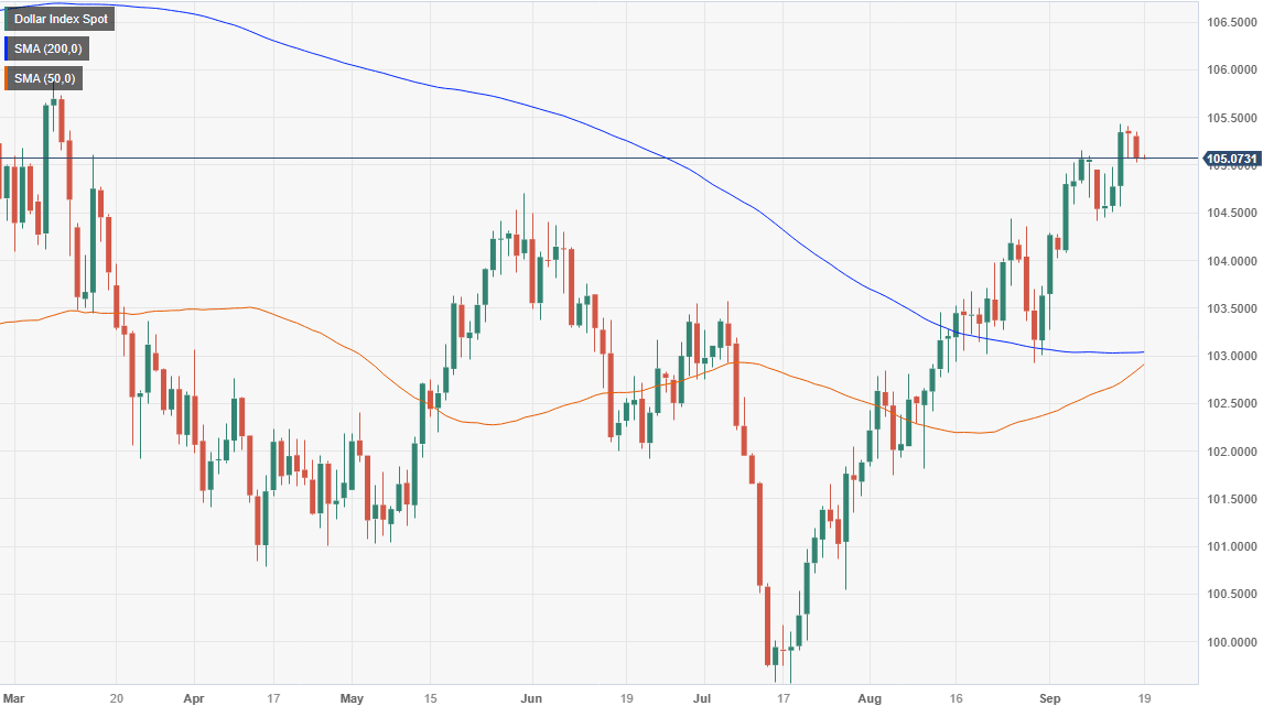 The US Dollar Index (DXY), a basket of six currencies that trades against the US Dollar, retreats a minuscule 0.25%, sponsored on a risk-on impulse and falling US Treasury bond yields, ahead of the Federal Reserve’s September meeting. Hence, the DXY is trading at 105.06, printing back-to-back days of losses.