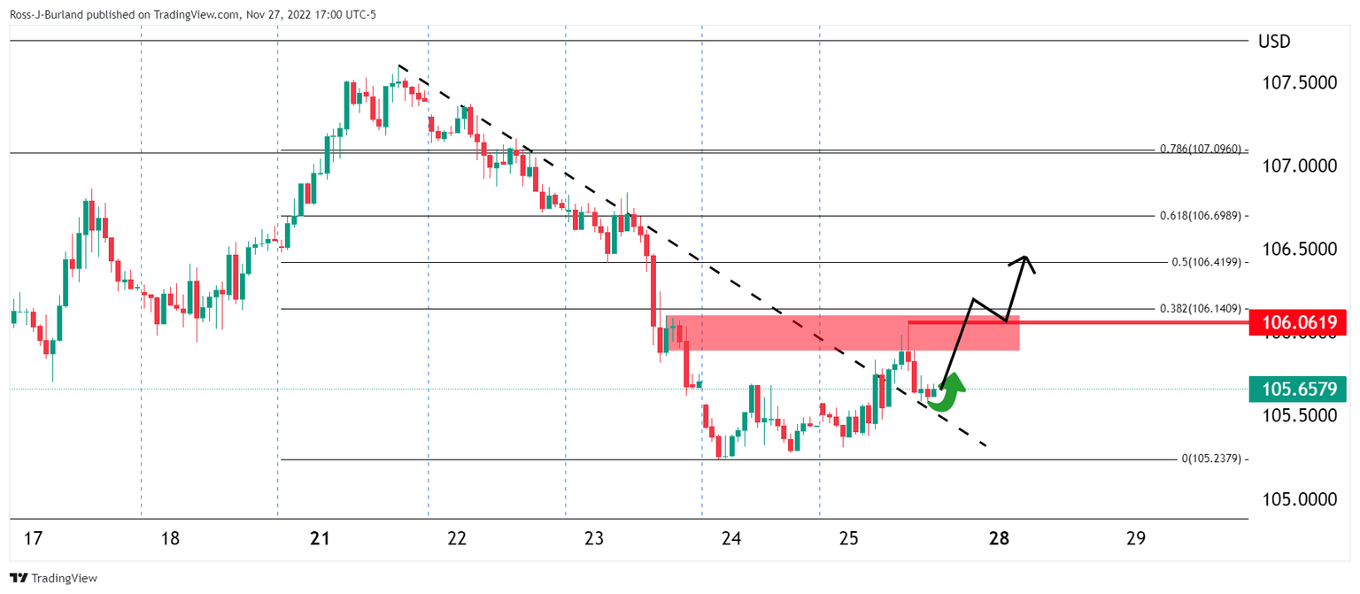 In doing so, the price could be expected to move in towards 106.50 on a break of resistance as per the following hourly chart: