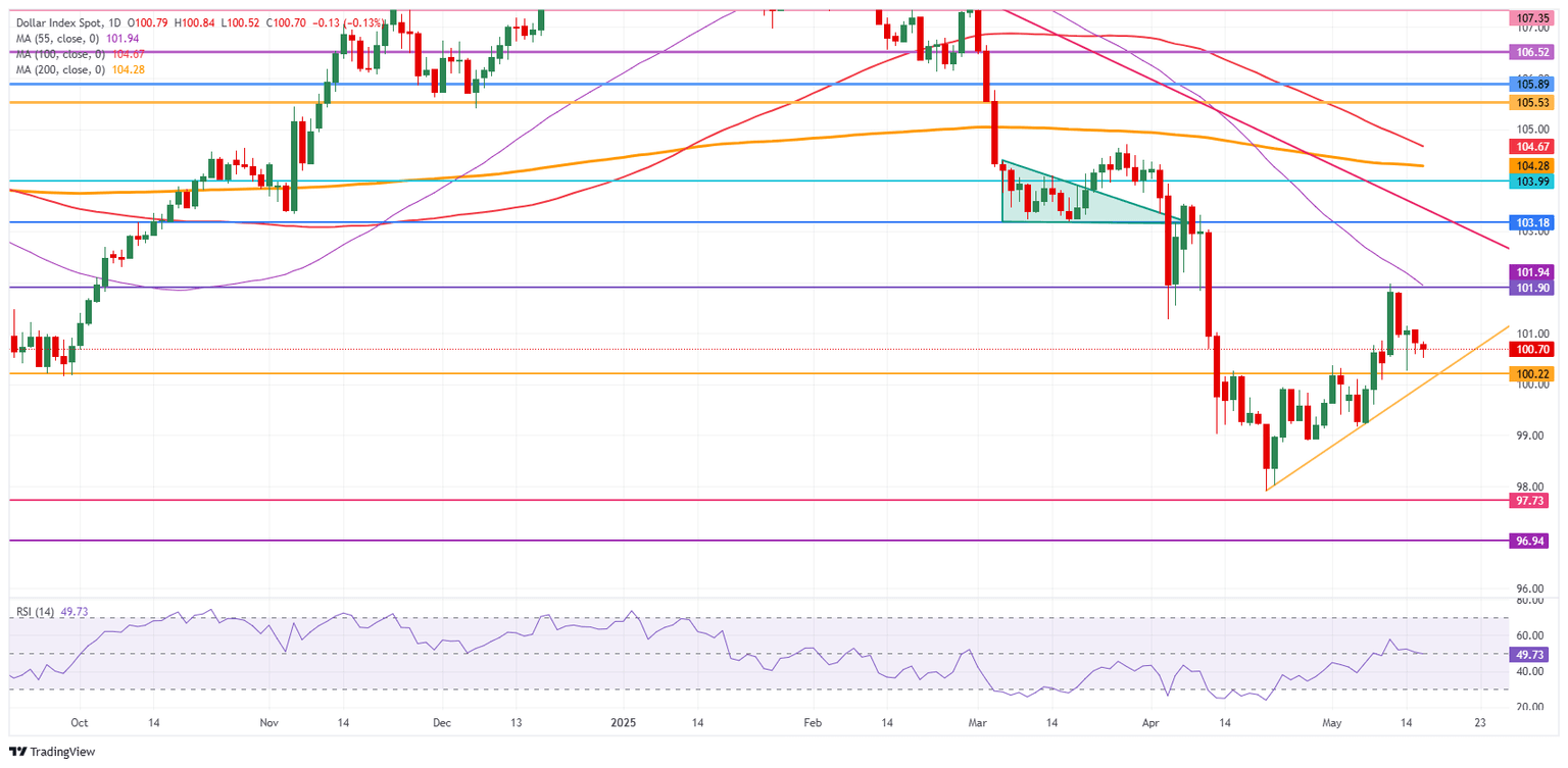 The US Dollar Index (DXY), which tracks the performance of the US Dollar (USD) against six major currencies, is trading flat around 100.80. The DXY is for now able to avoid a weekly loss while market participants are starting to raise questions over the stability of the Greenback. With United States (US) President Donald Trump flip-flopping on its tariff approach and how ill-conceived the first trade deals are, traders are starting to challenge the viability of the grand scheme from the Trump administration and its meaning towards the Greenback.
