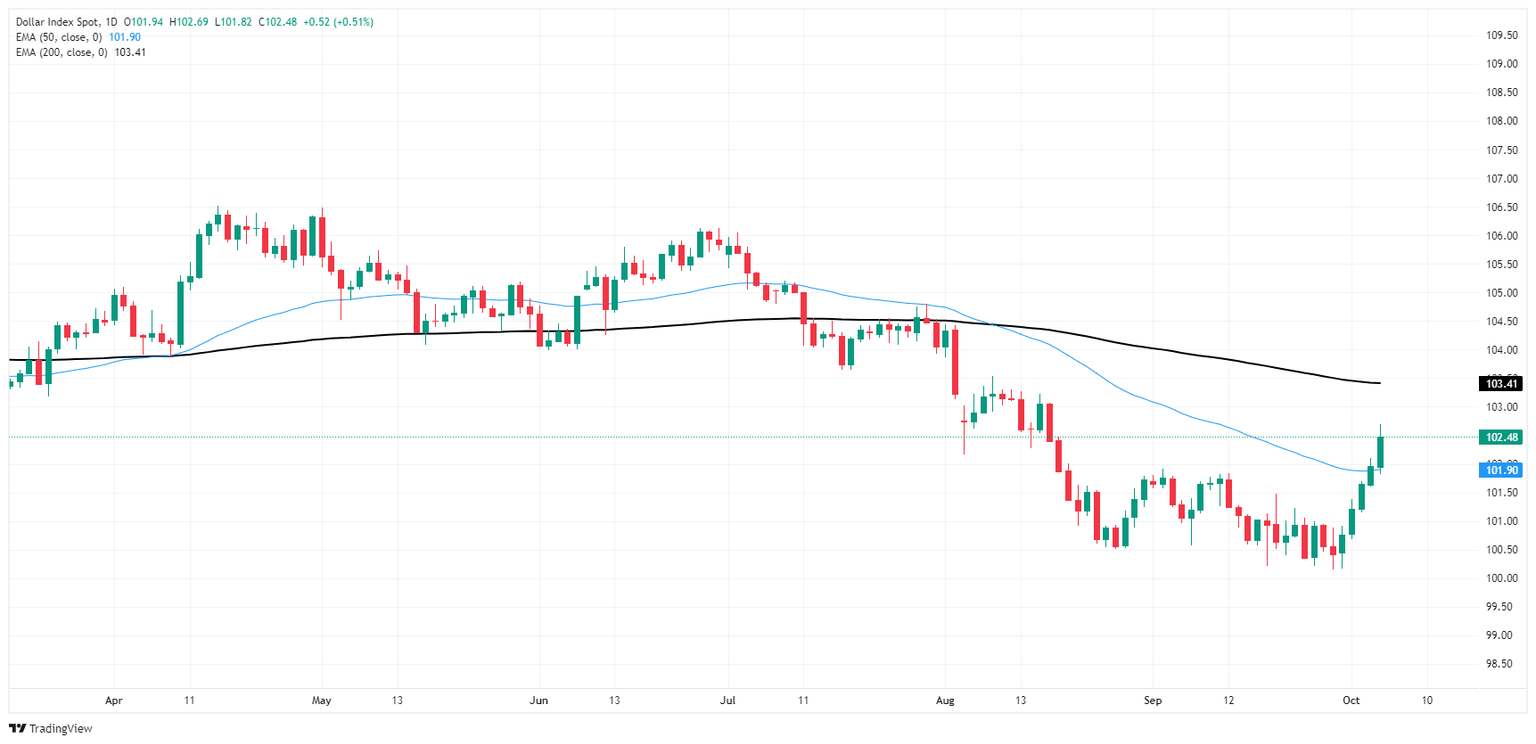 The Dollar Index (DXY) has been strong lately, breaking through important levels and going above 102.00. It has tested the 50-day Exponential Moving Average (EMA) at 101.90, which could be a significant barrier.