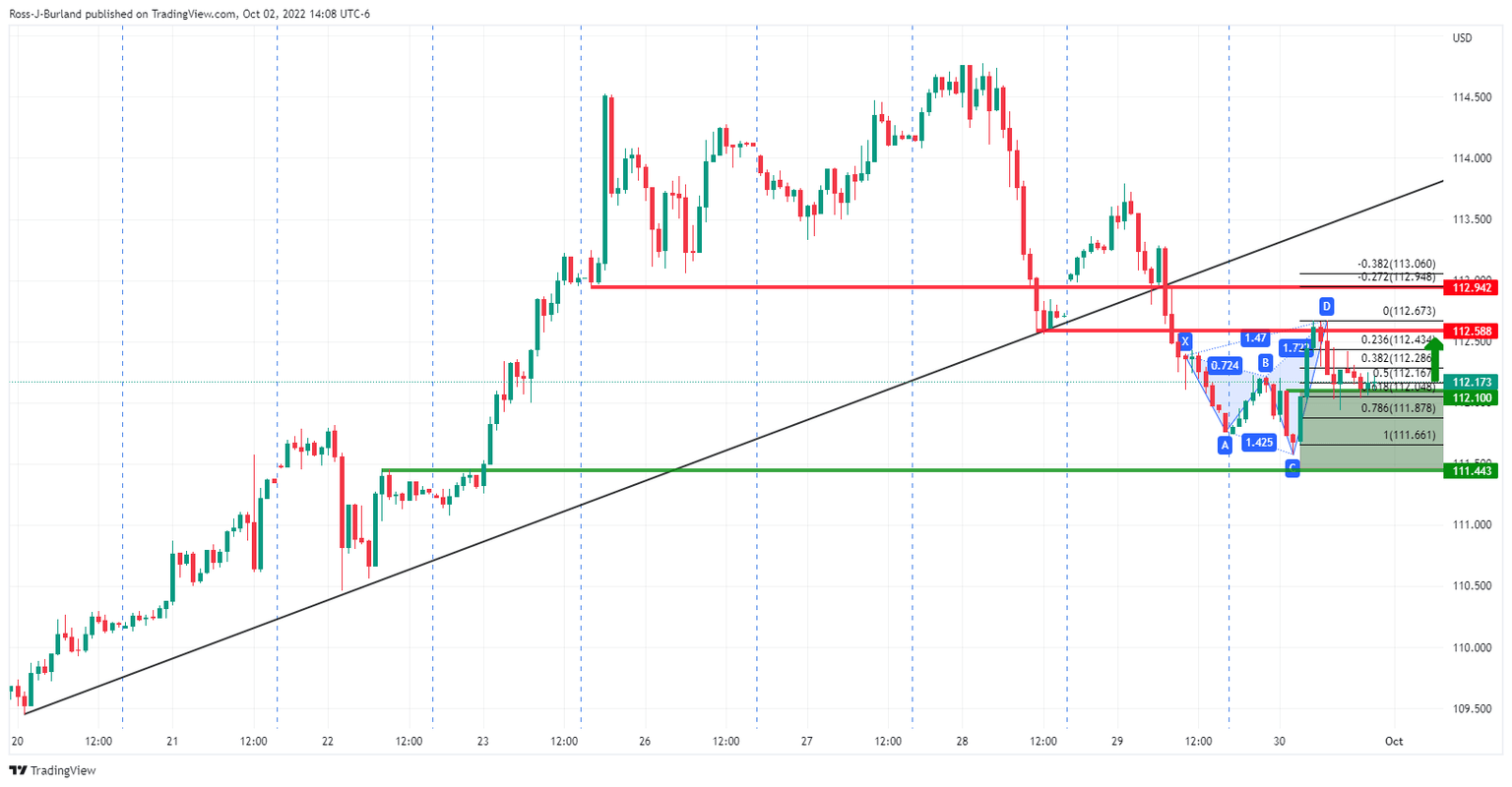 The harmonic pattern played out with the bears moving in at a key resistance structure to push the price all the way into the neckline of the formation in a significant retracement towards the 78.6% Fibonacci level. For the open, bulls will be in anticipation of a move towards the prior resistance near 112.70. This puts the focus on the downside for corresponding pairs such a cable: