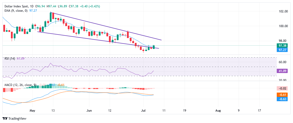 The US Dollar Index (DXY) is showing early signs of a technical recovery after briefly breaking below a well-defined falling wedge pattern last week. The breakdown appeared to be short-lived as the index has climbed back inside the wedge, hinting at a potential bear trap. The DXY is currently trading around 97.40, just above the 9-day Exponential Moving Average (EMA) at 97.28. A sustained move above the EMA would strengthen the bullish case, with the next upside target seen near the upper boundary of the wedge pattern, currently around 97.85–98.50.