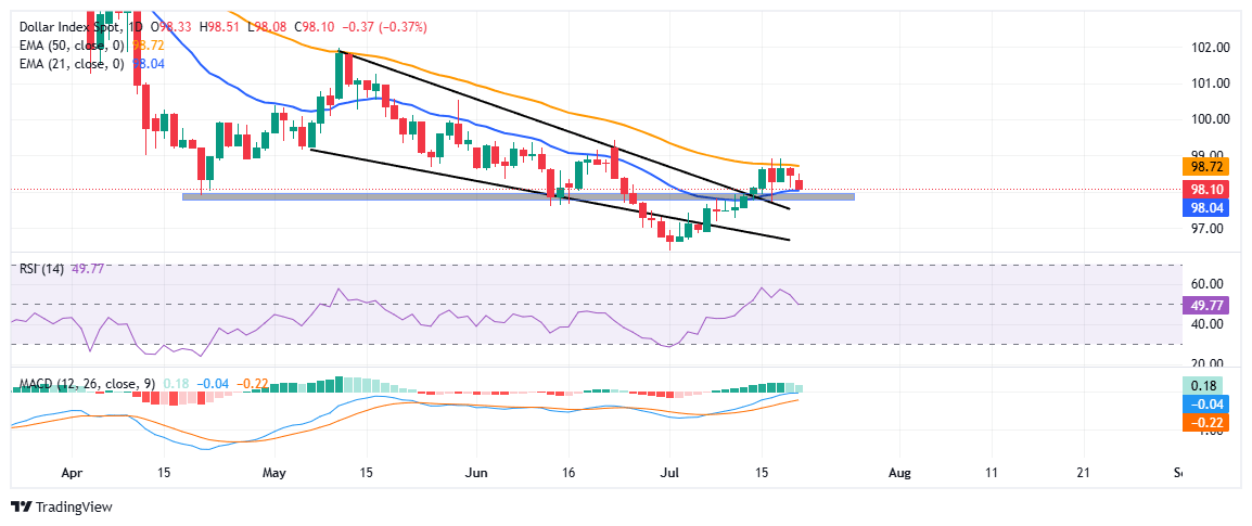 On the downside, the 97.80-98.00 zone has become a critical support area, aligning with the 21-day Exponential Moving Average (EMA) at 98.04 and the upper boundary of the former wedge pattern, which is now acting as a support level. This zone is critical to maintaining the bullish breakout structure. On the upside, the 50-day EMA, currently at 98.72, has consistently capped intraday advances, keeping the index in check throughout the last week.